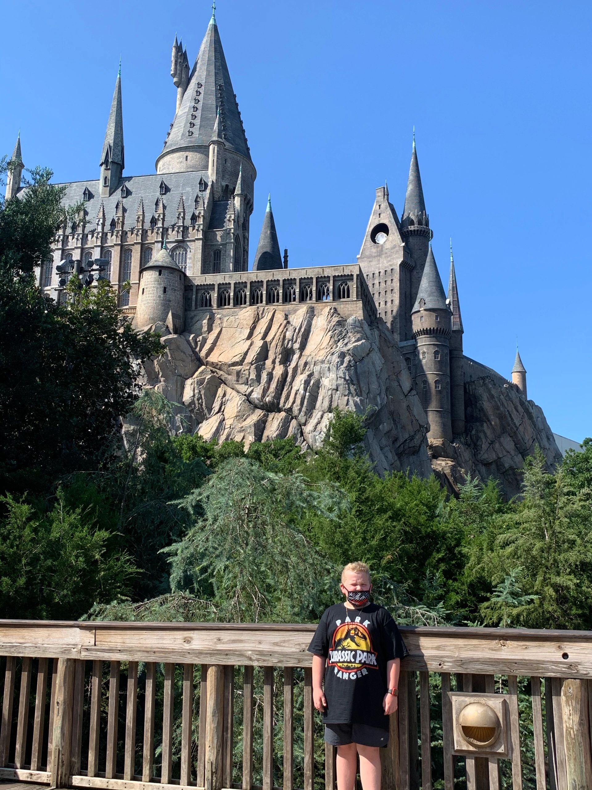 We woke up bright eyed and bushy tailed and ready for fun. We got dressed in our matching Jurassic Park shirts and took to Island of Adventure. The only bad part of this whole trip was that we had to wear these damn democratic face mask, all day in the park, on rides, so stupid! As soon as we walked thru the many points of entry, we lucked up and found our first penny machine. Colt and I love going around and smashing some pennies for our collection. We decided to walk to the far end of the park first and work our way back to the entrance, so off to Harry Potter world we went. I must issue this disclaimer, prior to this day, neither Colt of I had ever seen one minute of any of the Harry Potter movies. With that being said, after we left HP world, we agreed that we would order the movies and watch them all! that place was neat! Next up was the Jurassic Park portion of the park. We got to meet the raptor Blue and take a picture and we found two more penny machines, SCORE!